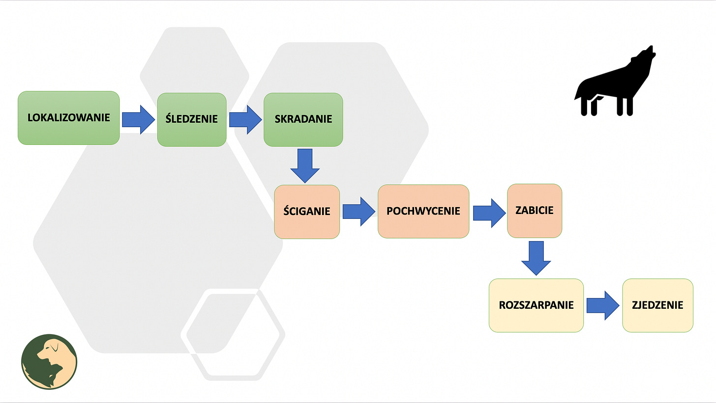 *Tutaj omawiam kompletną sekwencję zachowań drapieżnych (teoria). W praktyce pewne ogniwa bywają pomijane (zależnie od kontekstu sytuacji), jednakże ich kolejność czy intencje zostają zachowane.