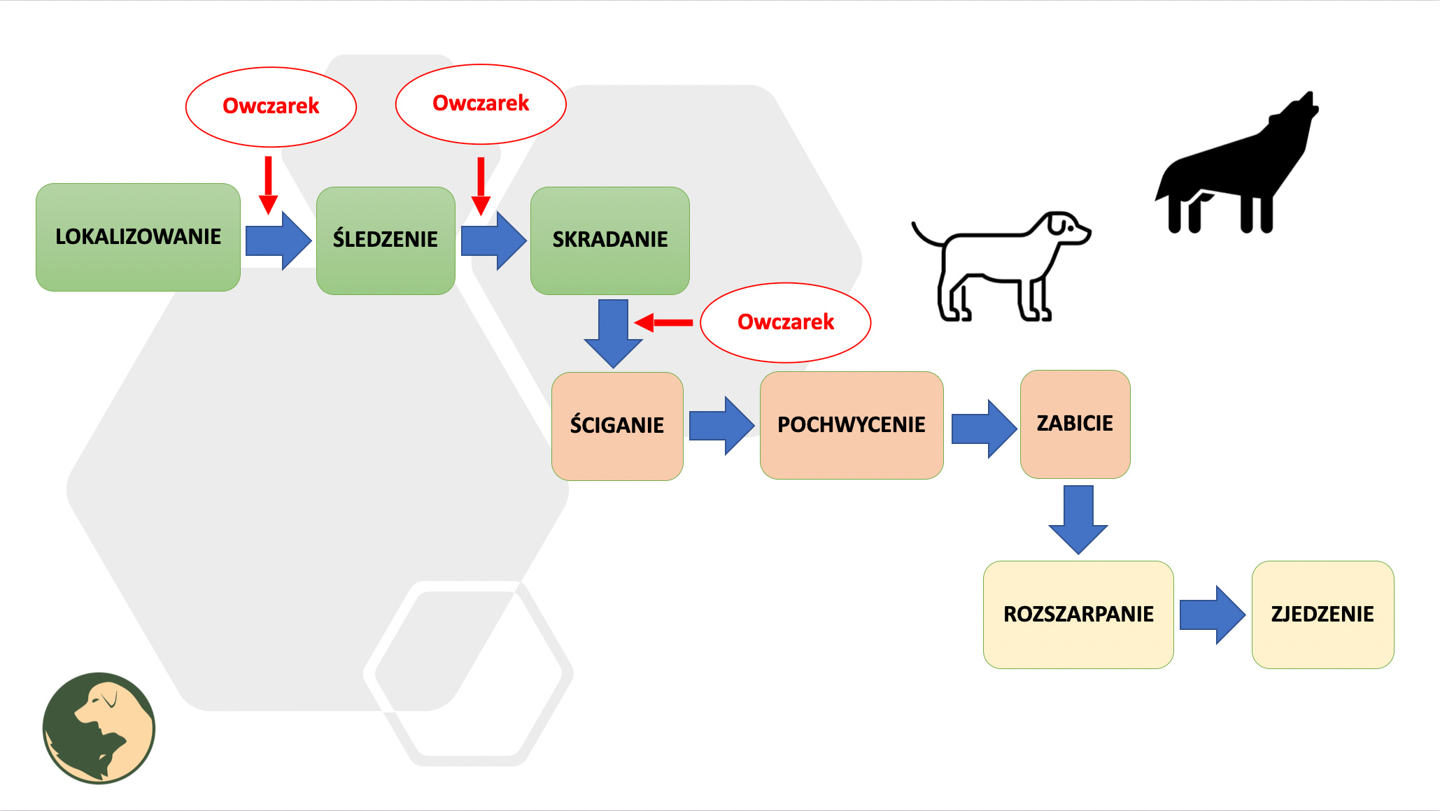 Wilk szary, skądinąd zwierzę drapieżne pokrewne psu domowemu, polując realizuje kolejne elementy sekwencji drapieżnej – łańcucha wg wzorca zachowań*, którego krańcowym ogniwem ma być konsumpcja zabitej zwierzyny (lub jej ucieczka). Sekwencję tychże zachowań można podzielić na trzy funkcjonalne sekcje